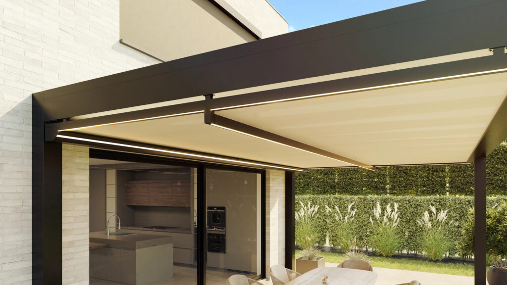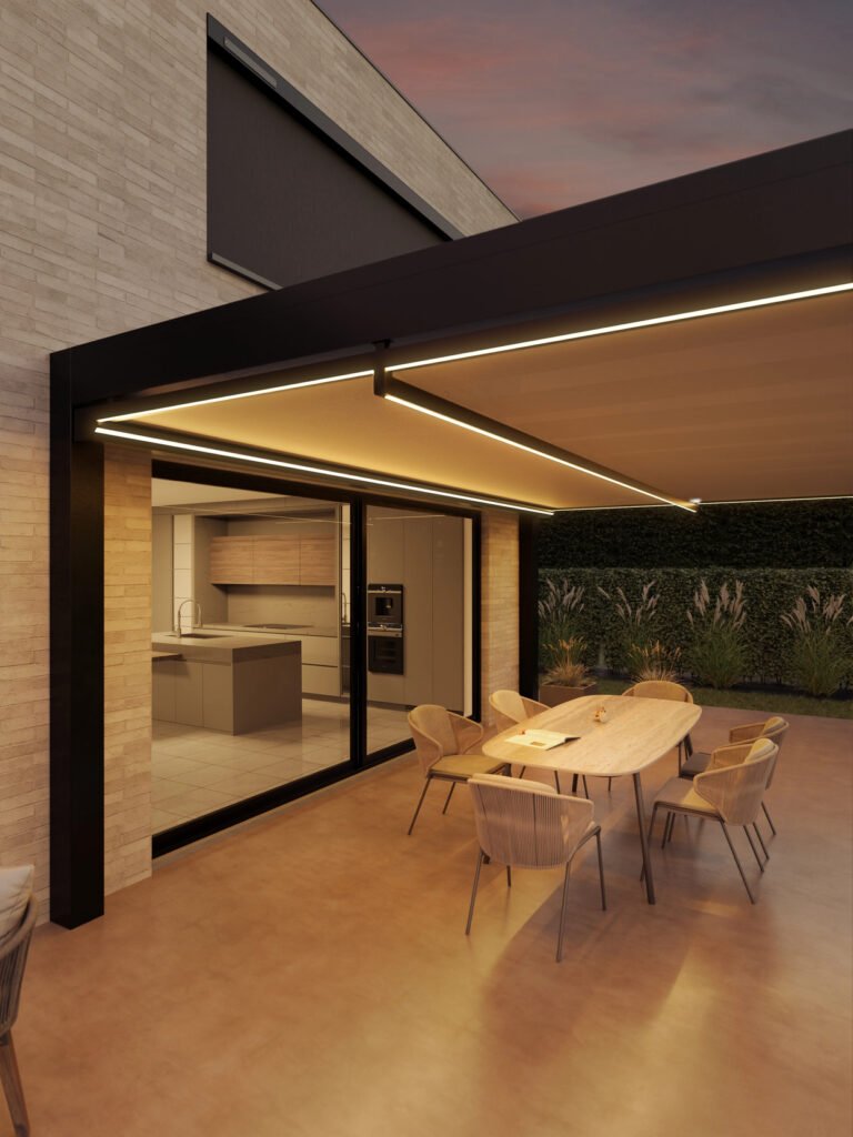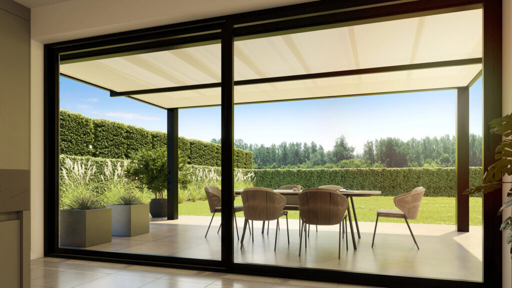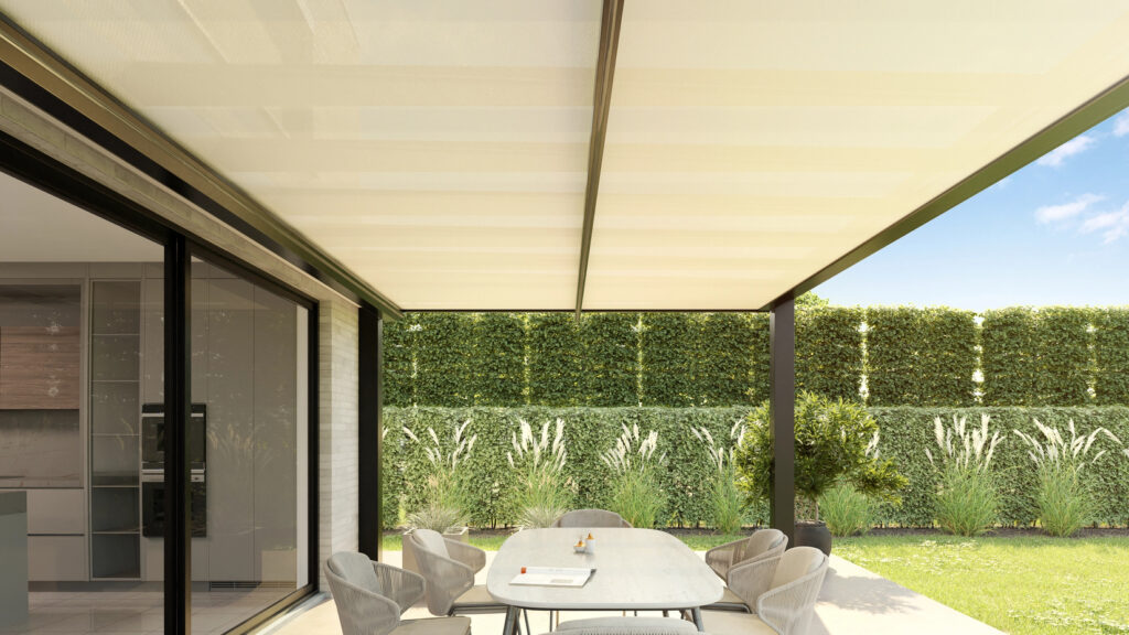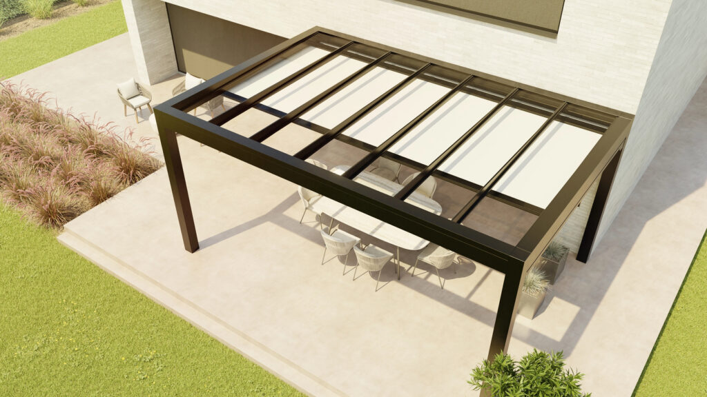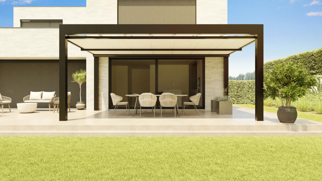 Ce style de pergola est idéal pour ceux qui souhaitent contrôler au maximum la lumière, l’air et le confort sur la terrasse.
