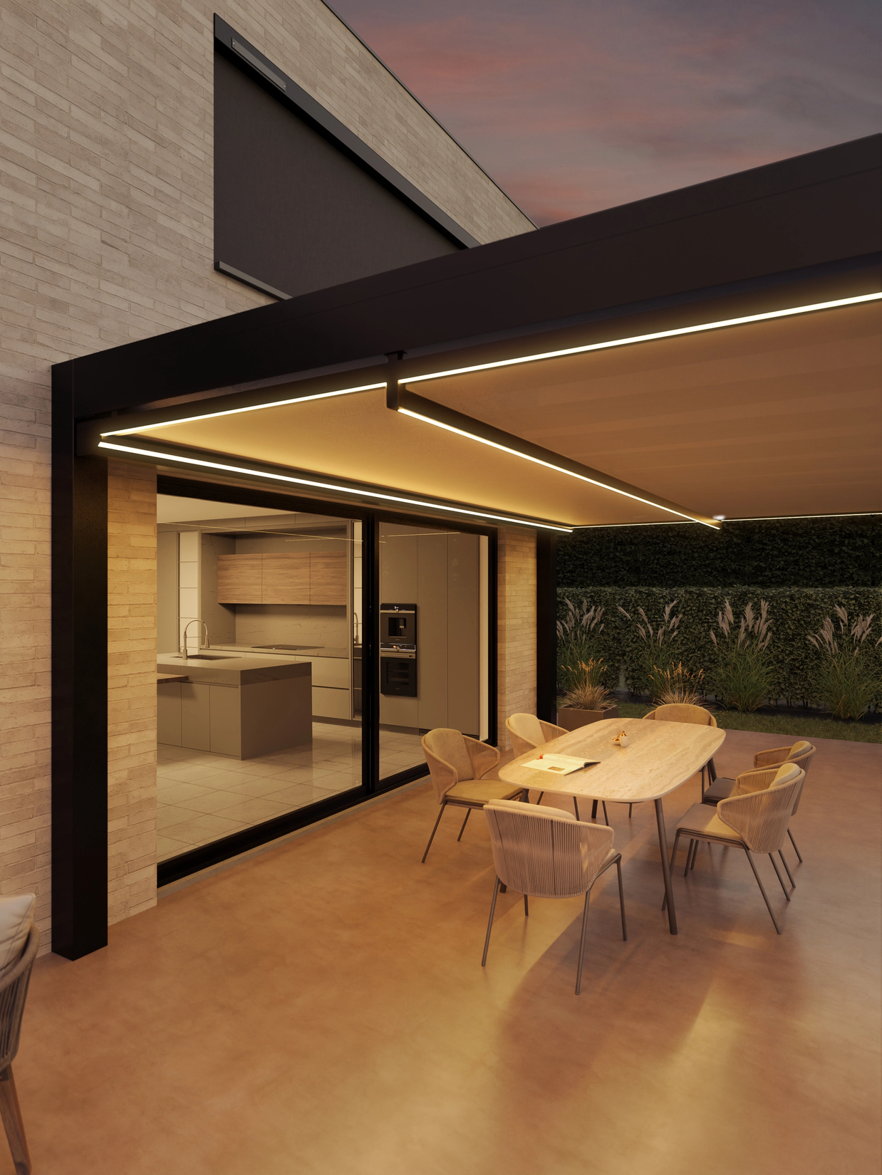 Personnalisez complètement votre protection solaire sous toiture Coolina grâce à des options telles que l’éclairage LED à intensité réglable dans le caisson, les coulisses ou le support de toile. L’éclairage à intensité réglable vous permet de créer facilement une atmosphère conviviale et chaleureuse en soirée. Vous assurez ainsi à tout moment une ambiance idéale, alliant confort absolu et parfaite adéquation avec votre style de vie, votre maison et vos goûts.